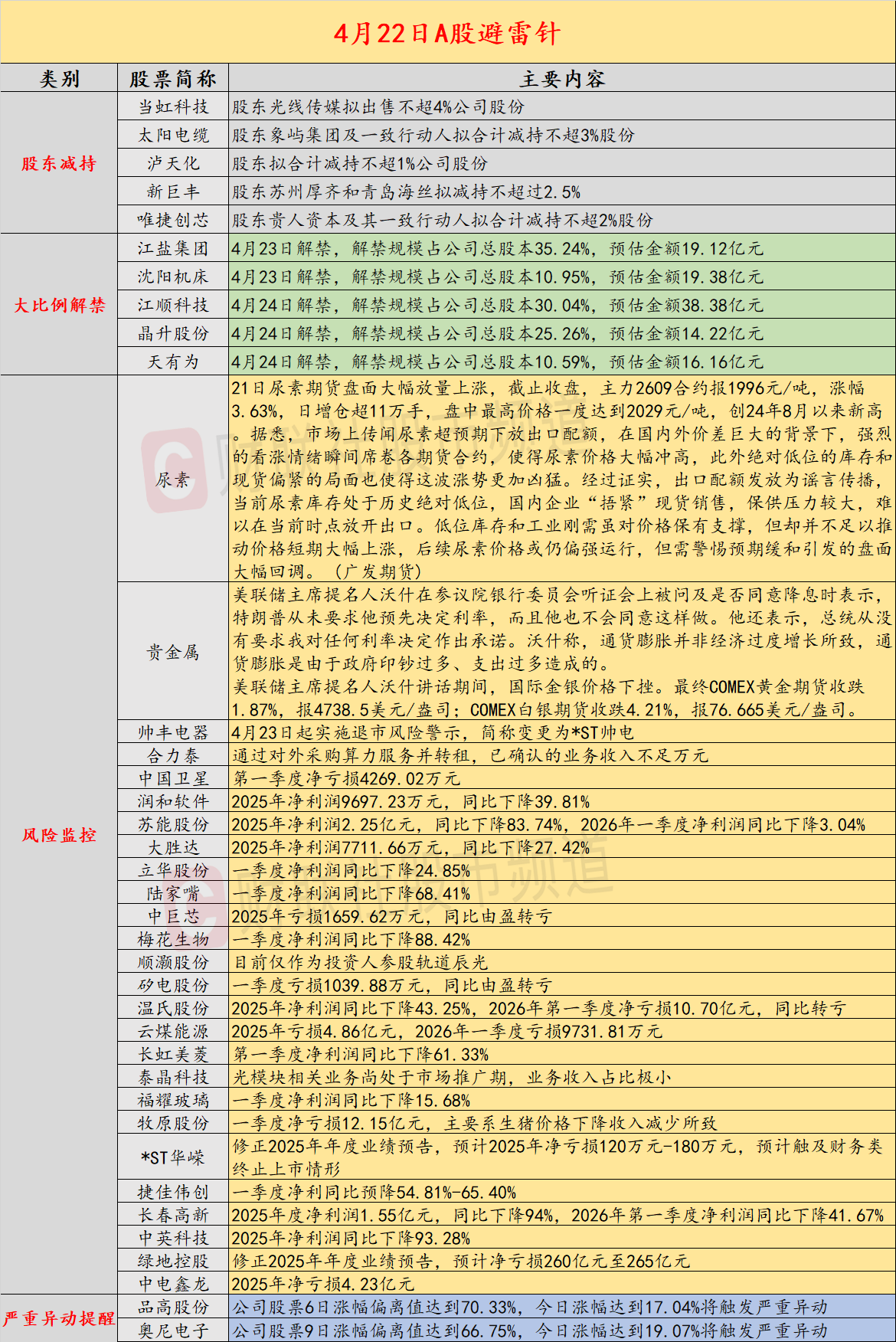 昨日公告的A股拟减持的公司数量较之前有所增多,当虹科技股东光线传媒拟出售不超4%公司股份,太阳电缆股东象屿集团及一致行动人拟合计减持不超3%股份;江盐集团、江顺科技将迎来超三成以上解禁;市场传闻“尿素超预期出口配额发放”为谣言,当前时点难以放开出口;帅丰电器4月23日起实施退市风险警示,简称变更为*ST帅电;短期内硫酸市场行情走稳为主,整体均价或表现为向下;合力泰通过对外采购算力服务并转租,已确认的业务收入不足万元;美股三大指数集体收跌,贵金属、加密货币概念跌幅居前。