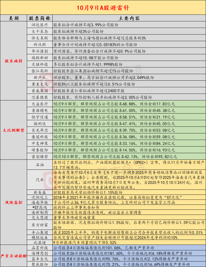 近日公告的A股拟减持的公司数量较之前有所减少,润达医疗股东拟合计减持不超3.99%公司股份,大千生态股东拟减持不超3%公司股份;天益医疗、普源精电将迎来超六成以上解禁;海南与温州暂停汽车置换更新补贴政策;新易盛控股股东高光荣拟询价转让1.15%股份;乘联分会秘书长崔东树发文,汽车经销商已难以摆脱生存困境;海南华铁子公司终止36.9亿元算力服务协议,上交所对其下发监管工作函;特朗普宣布对进口中型和重型卡车征收25%关税。