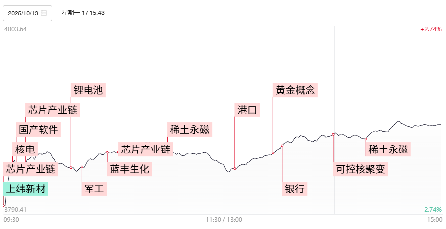 10月14日电,上个交易日市场全天震荡回升,三大指数低开高走,科创50指数低开近3%,午后翻红大涨逾1%。沪深两市成交额2.35万亿,较上周五缩量1609亿。1)包钢股份和北方稀土将2025年第四季度稀土精矿关联交易价格环比上调37%至26205元/吨,稀土永磁概念全天高开高走,中国稀土、北方稀土、包钢股份等十余股涨停,金力永磁、银河磁体、龙磁科技创历史新高。2)10月15日到10月17日,“湾芯展”将在深圳会展中心(福田)举行,深圳市相关官员公开确认,本土半导体企业新凯来将参展,并会“给大家带来惊喜”,新凯来概念为首的半导体设备股继续强者恒强,至纯科技全天封死一字涨停,新莱应材、凯美特气实现连板晋级。此外多家券商将中芯国际、佰维存储两融折算率分别再调回70%、50%,使得新凯来概念热度向整个半导体产业链扩散,科创芯片人气股华虹公司时隔1年多再度收获20厘米涨停,中芯国际大涨6%并反包上周五阴线。3)本周国际原子能机构聚变能大会将在成都举办,可控核聚变概念热度居高不下,人气股合锻智能晋级4连板,安泰科技开盘一字涨停晋级3连板,此外哈焊华通、联创光电、永鼎股份等多股创出历史新高。4)10月9日,商务部发布2025年第61号公告,除管制规则外,公告附件采用.wps格式,申请文件须以中文提交两大细节引发热议。早盘国产软件板块一度大幅冲高,中国软件、榕基软件涨停,金山办公、诚迈科技、麒麟信安等多股一度涨超10%。