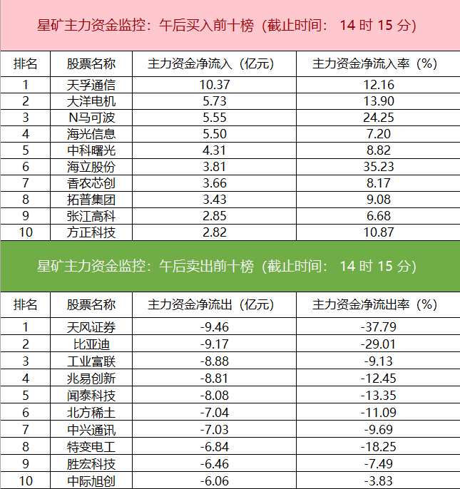 10月22日电,数据显示,今日主力资金净流入建筑材料、化学制药、石油石化等板块,净流出电子、电新行业、半导体等板块,其中电子板块净流出超75亿元。个股方面,天孚通信上涨,主力资金净买入10.37亿元位居首位,大洋电机、N马可波、海光信息主力资金净流入居前;天风证券遭净卖出超9亿元位居首位,比亚迪、工业富联、兆易创新主力资金净流出额居前。