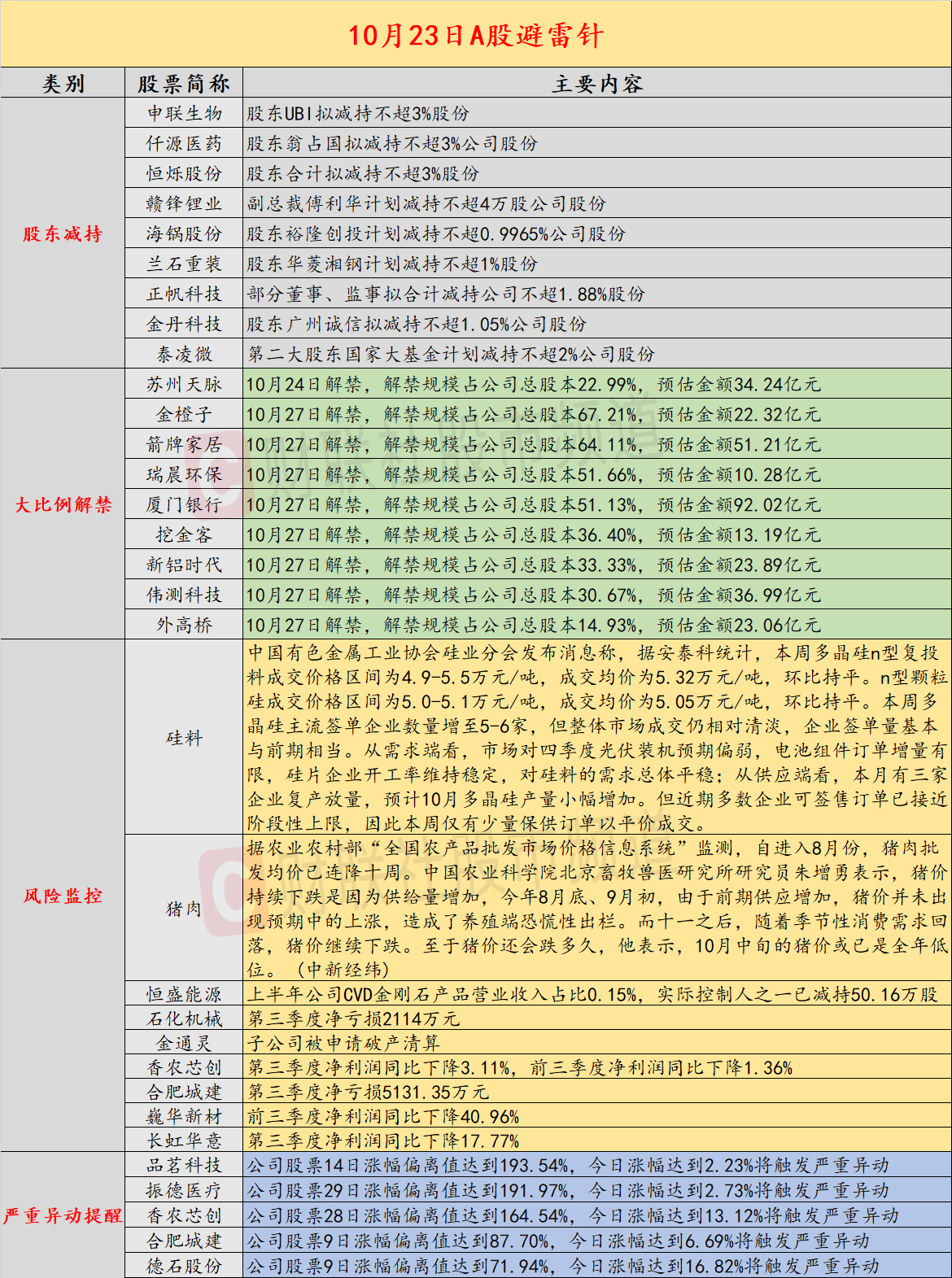 昨日公告的A股拟减持的公司数量较之前有所减少,申联生物股东UBI拟减持不超3%股份,仟源医药股东翁占国拟减持不超3%公司股份;苏州天脉、金橙子将迎来超二成以上解禁;本周多晶硅供需双弱,市场对四季度光伏装机预期偏弱;恒盛能源公告,上半年公司CVD金刚石产品营业收入占比0.15%,实际控制人之一已减持50.16万股;猪肉价格连降10周,10月中旬或已是全年低位;三连板石化机械第三季度净亏损2114万元;美股三大指数集体收跌,奈飞跌超10%。