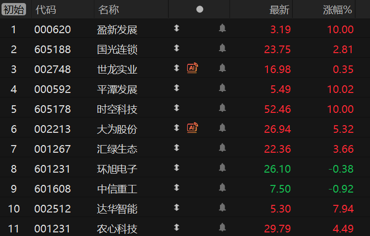 10月28日电,市场焦点股盈新发展(6板)竞价涨停,零售股国光连锁(11天6板)高开2.81%,氯化亚砜概念股世龙实业(5板)高开0.35%,福建本地股平潭发展(7天5板)竞价涨停,存储芯片板块时空科技(4板)竞价涨停、大为股份(5天3板)高开5.32%,算力产业链的汇绿生态(6天4板)高开3.66%、环旭电子(5天3板)低开0.38%,商业航天概念股中信重工(6天4板)低开0.92%、达华智能(3板)高开7.94%,农药股农心科技(3板)高开4.49%。