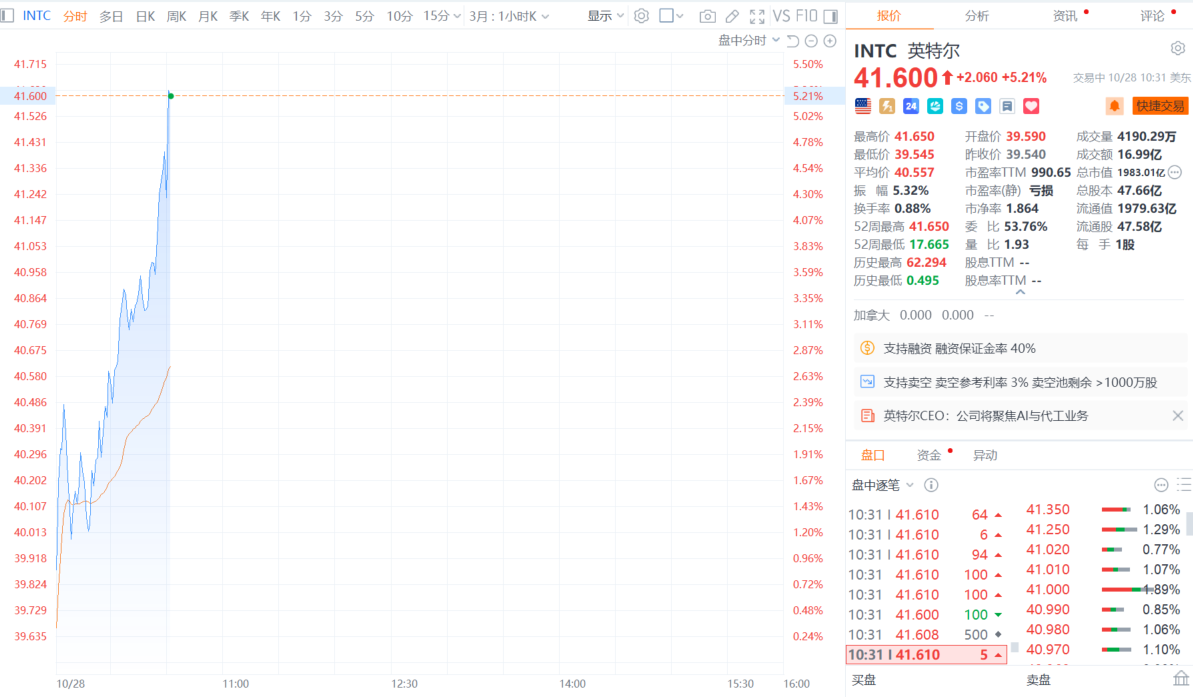 10月28日电,英特尔涨幅扩大至5%,报41.6美元/股,再创新高。