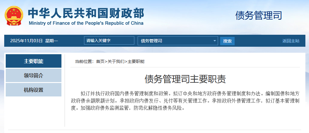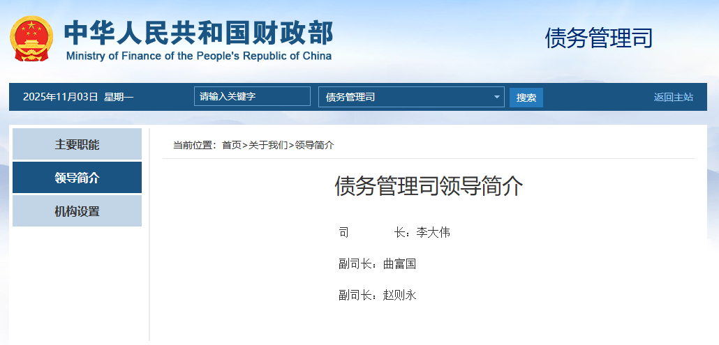 11月3日电,近日,财政部官网“机构设置”栏目更新信息显示,财政部债务管理司已列入“部机关”列表。官网介绍,债务管理司主要职责包括:拟订并执行政府国内债务管理制度和政策。拟订中央和地方政府债务管理制度和办法。编制国债和地方政府债余额限额计划。承担政府内债发行、兑付等有关管理工作。承担政府外债管理工作,拟订基本管理制度。加强政府债务监测监管,防范化解隐性债务风险。财政部债务管理司领导包括:司长李大伟,副司长曲富国、赵则永。财政部债务管理司设六个处:综合处、中央债务处、地方债务一处、地方债务二处、发行兑付处、监测管理处。