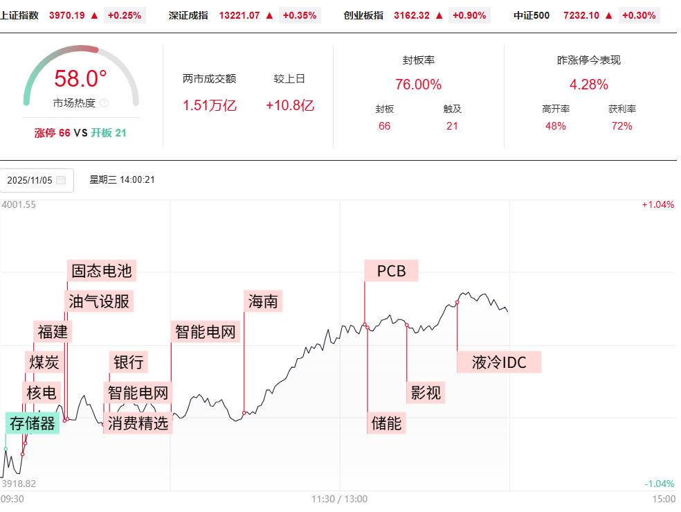 市场午后弱势拉升,创业板指涨幅一度扩大至1%,早盘一度跌超2%。成交量方面,第一个小时两市放量842亿,预计两市全天成交1.86万亿。下午情绪加速回暖,超80只个股涨停,封板率升至近80%。热点轮番活跃,储能板块率先走强,通润装备涨停创确实新高,阿特斯20cm涨停。电网设备板块午后延续强势,掀起一波涨停潮,京泉华3连板,板块内20只个股涨停。