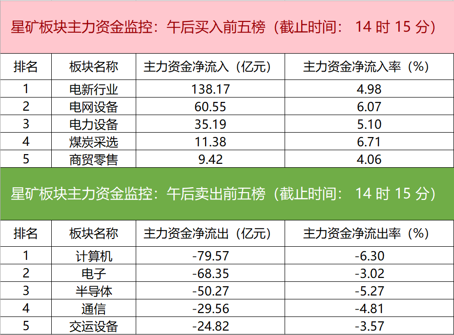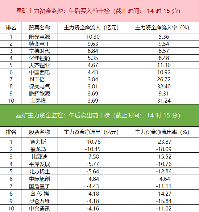 11月5日电,数据显示,今日主力资金净流入电新行业、电网设备、电力设备等板块,净流出计算机、电子、半导体等板块,其中电新行业净流入超138亿元。个股方面,阳光电源主力资金净买入10.30亿元位居首位,特变电工、宁德时代、亿纬锂能主力资金净流入居前;赛力斯遭净卖出近10亿元位居首位,福龙马、比亚迪、平潭发展主力资金净流出额居前。