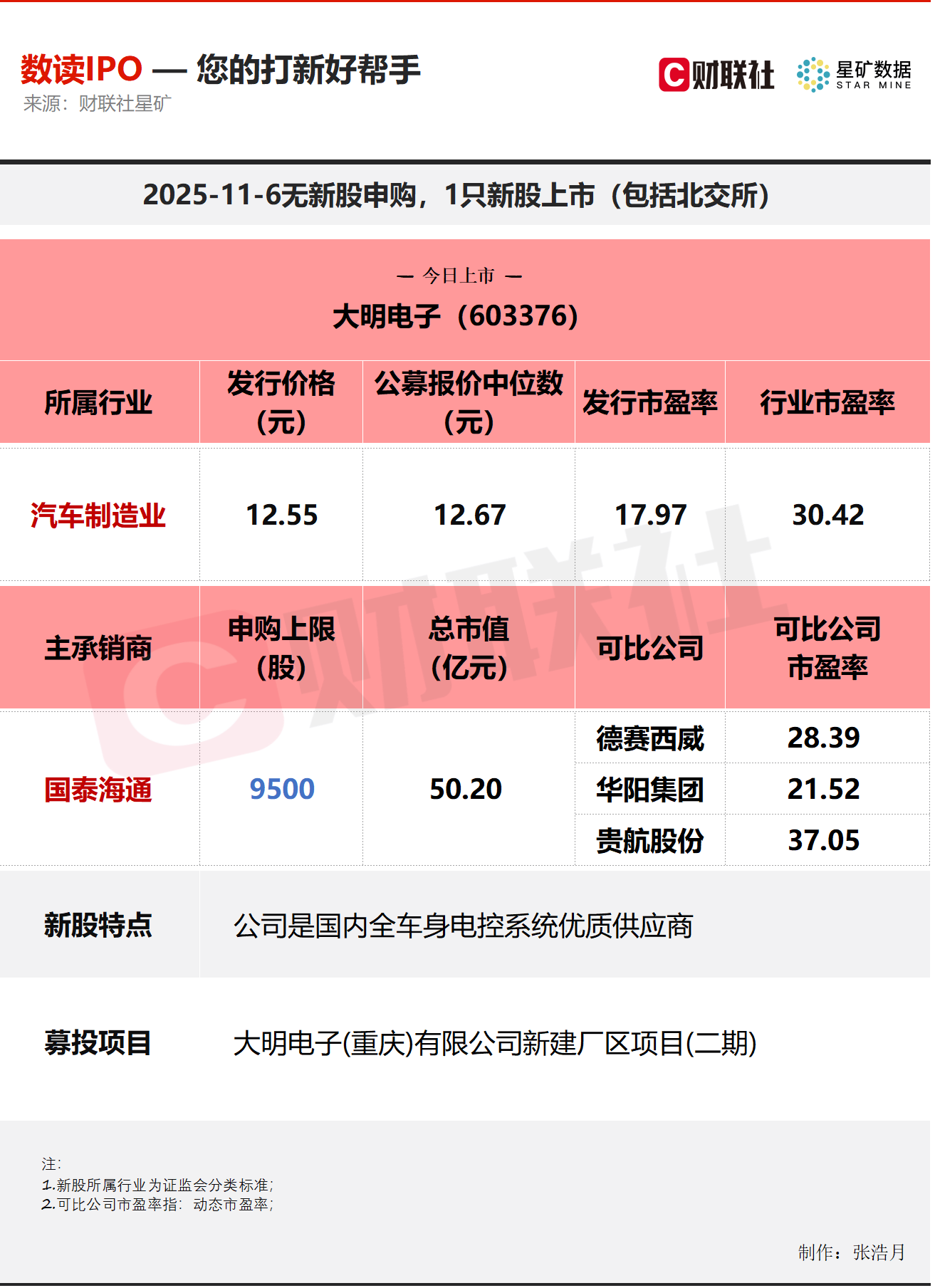 11月6日电,今日无新股申购;有1只新股上市,为沪市主板的
