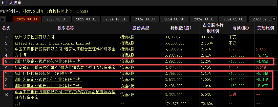 截止三季度末,湖州旭腾、杭州佳扬、湖州朔谊及湖州迅嘉分别持有联德股份1.20%、1.15%、1.09%及1.04%股份,为公司的第五、第七、第八和第九大股东。联德股份8月26日公告,湖州旭腾、杭州佳扬、湖州朔谊和湖州迅嘉计划合计减持不超过2.37%公司股份。公司11月1日公告,2025年9月25日至2025年10月30日期间上述股东合计持有公司股份比例由66.65%减少至65.96%,权益变动比例触及1%刻度。