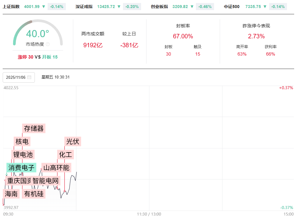 市场早间弱势震荡,创业板指一度跌超1%。成交量方面,第一个小时两市缩量308亿元,预计全天成交超1.9万亿。板块方面,热点快速轮动,早盘市场热点集中在化工、海南、光伏等方向,其中化工板块最为强势,澄星股份、清水源2连板,氯碱化工、泸天化等多股涨停。海南板块表现活跃。海马汽车6天5板。光伏板块震荡走强,合盛硅业、亿晶光电均涨停。但短线情绪出现分化,连板股晋级率较低,连续两日跌至两成,高位股合富中国、平潭发展走弱。